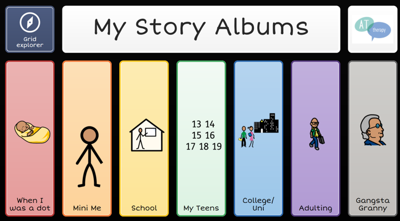 This grid set has been designed by Francesca Sephton at ATtherapy. It is designed to support communication aid users to share their stories throughout their life. It is a template to be heavily personalised for an individual.