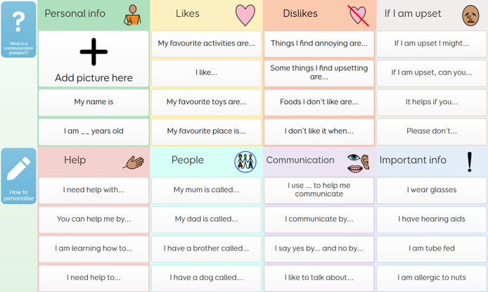 This grid set is a template for a simple one-page Passport to be either used by the individual on their device, to tell people about their needs, or as a printable resource.